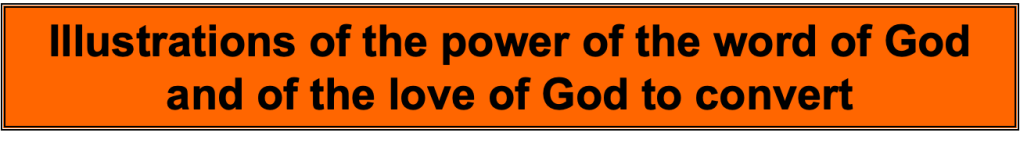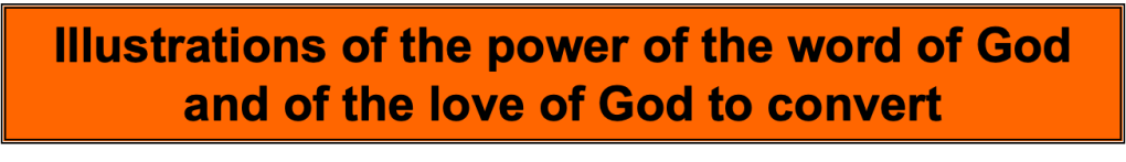•A true story of a drunk in a mission hall. When a call to commit one’s life to the Lord was given, this drunk staggered to the front and gave his life to the Lord. The preacher was chuffed. So he asked the man, “What part of my message was it that made you want to give your life to the Lord? He was humbled when the man replied, “It wasn’t anything you said guv’nor. It was the words on the wall behind you, “For God so loved the world that He gave His only begotten Son, so that whoever believes in Him should not perish but may have etenal life.” [John 3:16] As St Paul wrote, it is the word of God that produces faith, Rom 10:17 “So faith comes from hearing, and hearing through the word of Christ.“