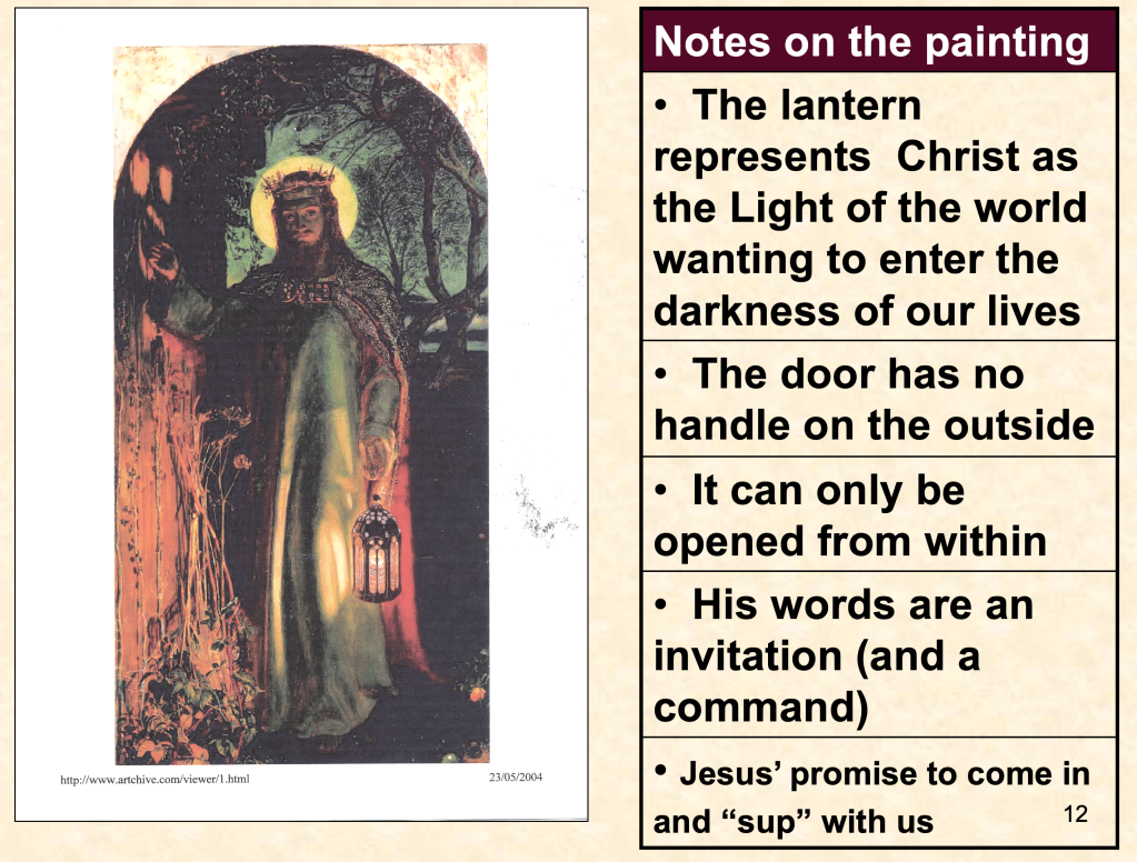 The words of Revelation 3:20 were symbolised by Holman Hunt in the painting, “The Light of the World”a copy of which hangs in St Paul’s Cathedral, London.“Behold, I stand at the door and knock. If anyone hears my voice and opens the door, I will come in to him and eat with him, and he with me.” Christ wants to come into our lives to begin a life of never-ending fellowship with Him.