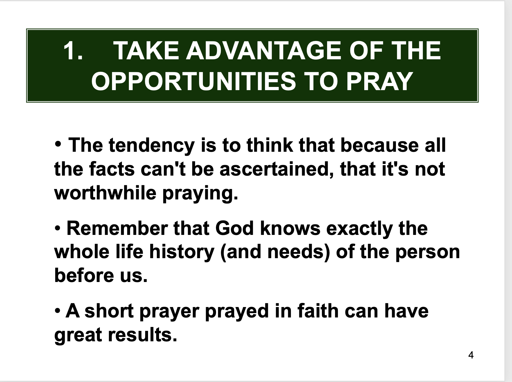 Often the person wanting prayer support may be unknown to us. We can’t as pray-ers become their best friend in a matter of minutes. But as we treat them and their concerns seriously, their trust in us can grow. It may be that eventually they say something like, “Look, the real reason I came for prayer is this.” Then they begin to share with us their deeper need.