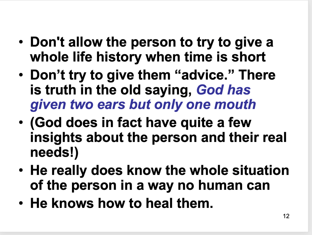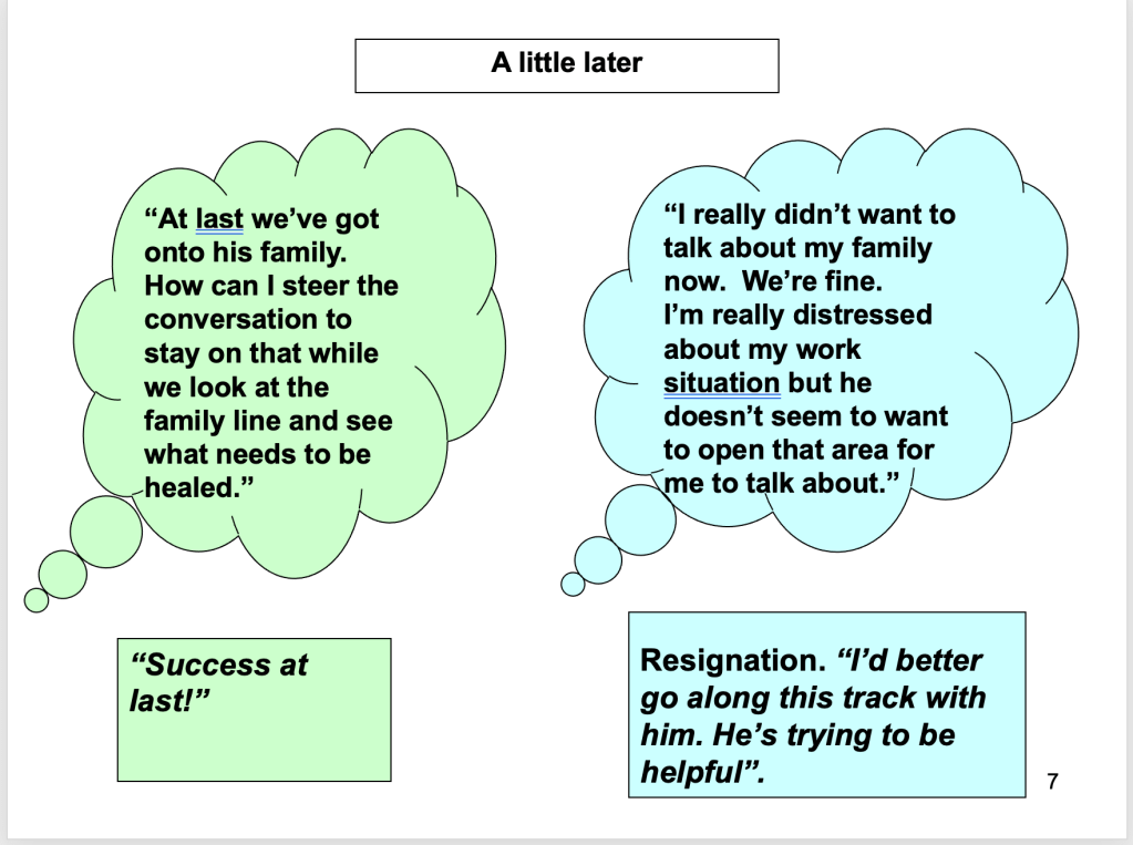 The following slide provides a scenario of what can happen when we fail to listen to the person we are trying to help. The pray-er thinks he has had some success while the person wanting help sees that the pray-er has lost the plot and is resigned to follow the pray-er’s approach, even though it is not covering their concerns.
