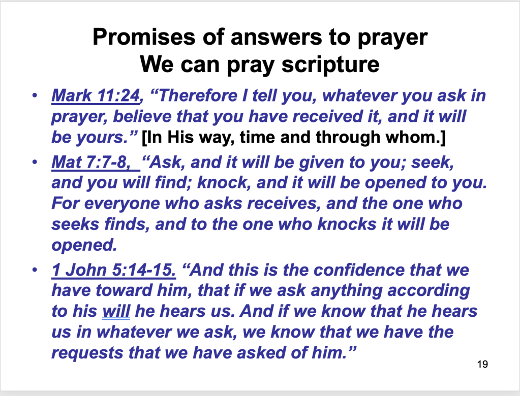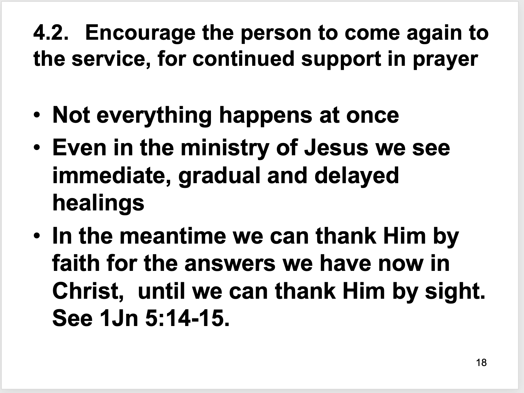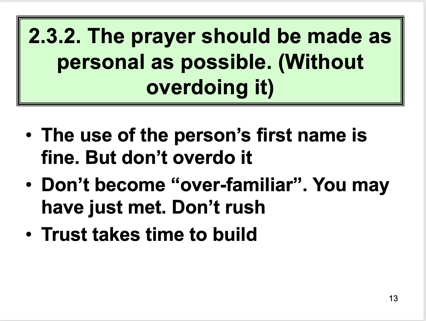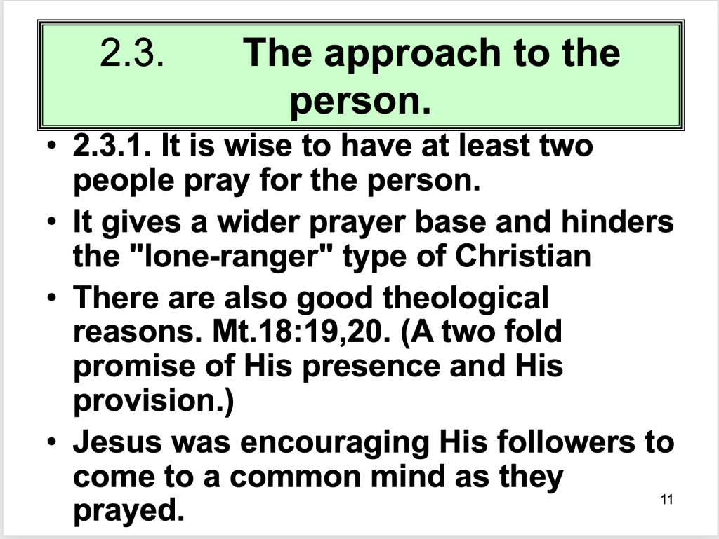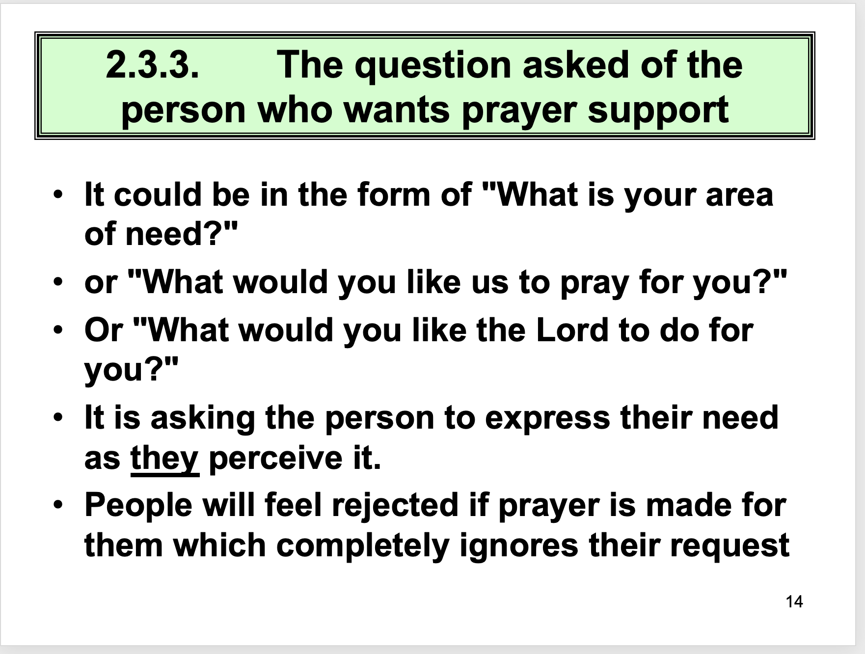 In 2.3.3 the best question to ask may be the third question, “What do you want the Lord to do for you?” It immediately reminds the pray-ers and the person wanting prayer support that it is the Lord Himself who is the healer. As James 5:15 puts it, “And the prayer offered in faith will make the sick person well; the Lord will raise them up. If they have sinned, they will be forgiven.” It is the Lord who answers believing prayer.