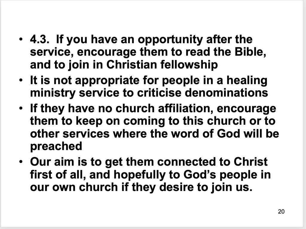 In 3.1we note that sometimes we notice changes in the way those coming to us for prayer speak about certain people. It may be that we notice their speech becomes quite bitter as they mention a certain person. It is not wise to say to them, ‘We noticed you became quite bitter when you mentioned that person’s name. Do you want us to pray for that bitterness to leave you?” They haven’t asked you to pray about bitterness and may feel that you are prematurely judging them. That doesn’t help when the person feels as though the pray-ers are being critical of them. Far better for the pray-ers to say at the end of the prayer time, “Is there anything else we can pray for you?” It may be that they then say, “Look, I have a real problem with bitterness. Would you pray for it to go from me?”