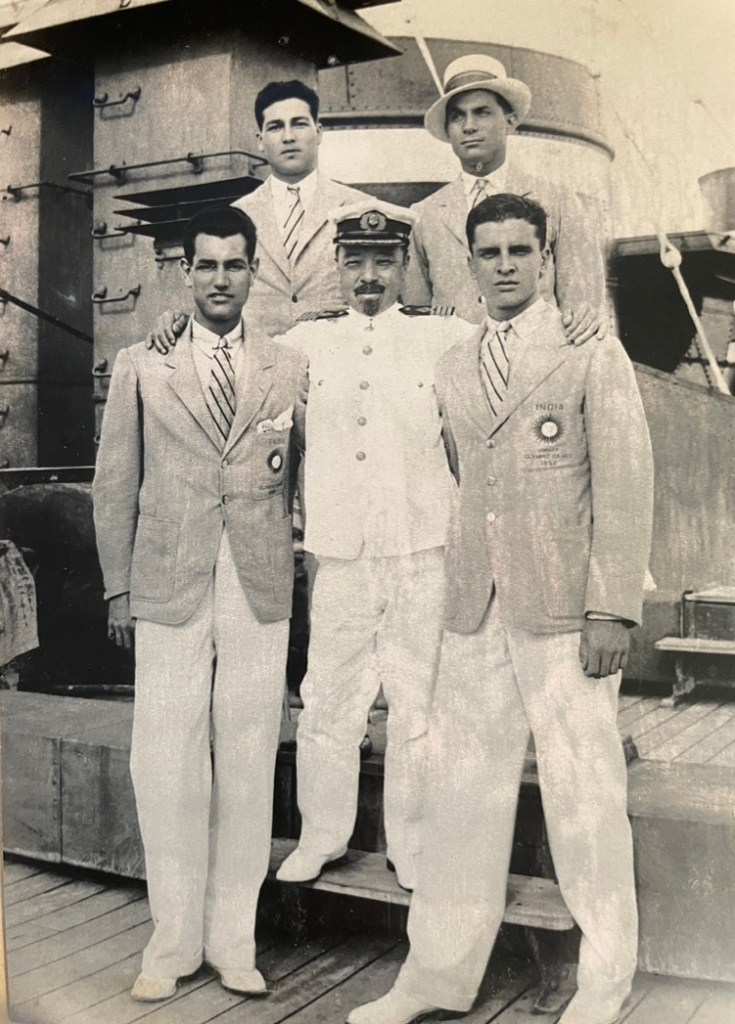 Indian hockey team members on the voyage to Los Angeles for the 1932 Olympic Games. Carl is on the left of the ship’s Captain.